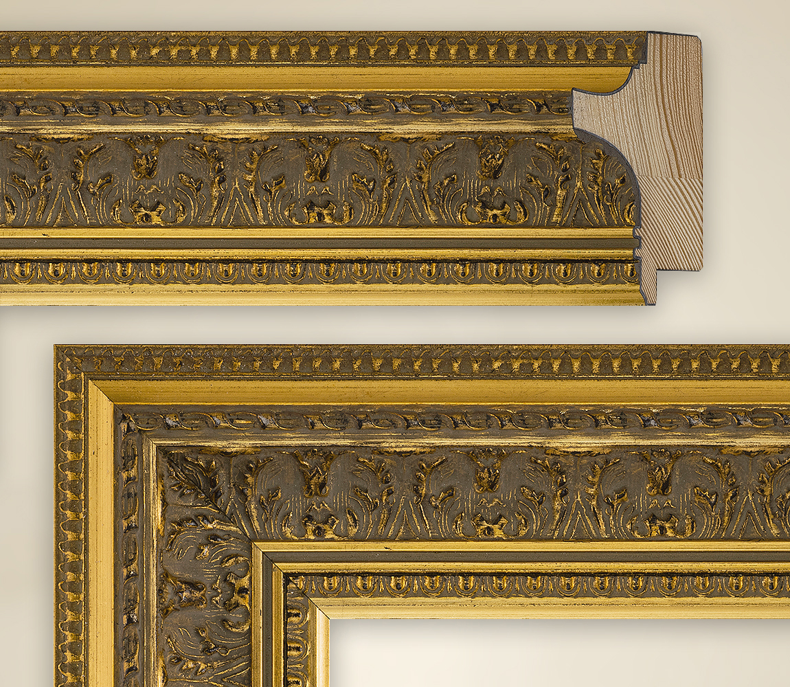| La cornice pittorica Nelly è impressionante in ogni galleria di immagini, ma anche per ogni collezionista privato che apprezza le cornici sublimi per le sue stampe d'arte. Con questo modello, la serie di cornici Van Gogh presenta un'ulteriore cornice dorata, che i designer hanno creato in un magnifico pezzo in termini di colore, forma e design con varie modanature. Su una larghezza totale di 79 mm, qui si possono vedere i bordi, a volte senza ornamenti, ma sempre abilmente coordinati e disposti in un ordine che vale la pena vedere. Sul bordo esterno, Nelly inizia con la prima barra ornamentale stretta, che mostra piccoli collegamenti a catena triangolari su uno sfondo marrone scuro. Una depressione color oro conduce alla parte più alta della cornice, che viene spinta nella stanza come una lingua quadrata di 43 mm. Anche qui, elementi dorati su marrone si presentano come un ornamento prima che il grande bordo principale si spinga indietro verso il muro. Qui predomina il marrone scuro, in modo che le strutture dorate su di esso appaiano molto delicate. Le strisce strette successive sono chiamate oro, marrone e oro, e sono accompagnate da un altro bordo ornamentale prima che un'ultima striscia d'oro formi la conclusione collettiva. La visione d'insieme è dominata dal marrone scuro, che, con l'oro lucido, rappresenta un eccellente ensemble. |