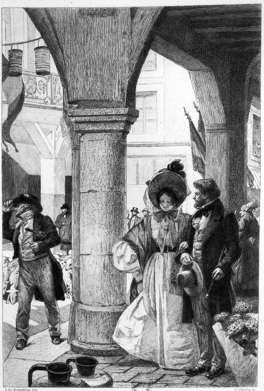 Emma Bovary che cammina con un compagno da 'Madame Bovary' di Gustave Flaubert, inciso da Carlo Chessa (1855-1925), 1906(Emma Bovary walking with a companion from 'Madame Bovary' by Gustave Flaubert, engraved by Carlo Chessa (1855-1925), 1906 )Alfred Paul Marie Richemont |