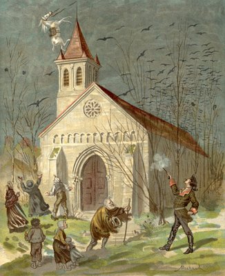 Il Barone dimostra di essere un buon tiratore, da 'Le Avventure del Barone di Munchausen' di Rudolf Erich Raspe (1736-94) pubblicato c.1886(The Baron prooves himself a good shot, from 'The Adventures of Baron Munchausen' by Rudolf Erich Raspe (1736-94) published c.1886 )Alphonse Adolphe Bichard |