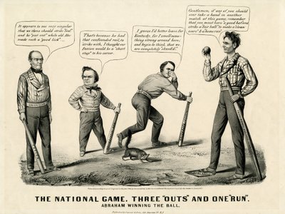 Cartone animato che mostra Abraham Lincoln (1809-65) vincere la palla contro i suoi avversari Douglas, Bell e Breckenridge nelle elezioni presidenziali del 1860, 1860(Cartoon showing Abraham Lincoln (1809-65) Winning the Ball against his opponents Douglas, Bell, and Breckenridge in the Presidential Election of 1860, 1860 )American School |
