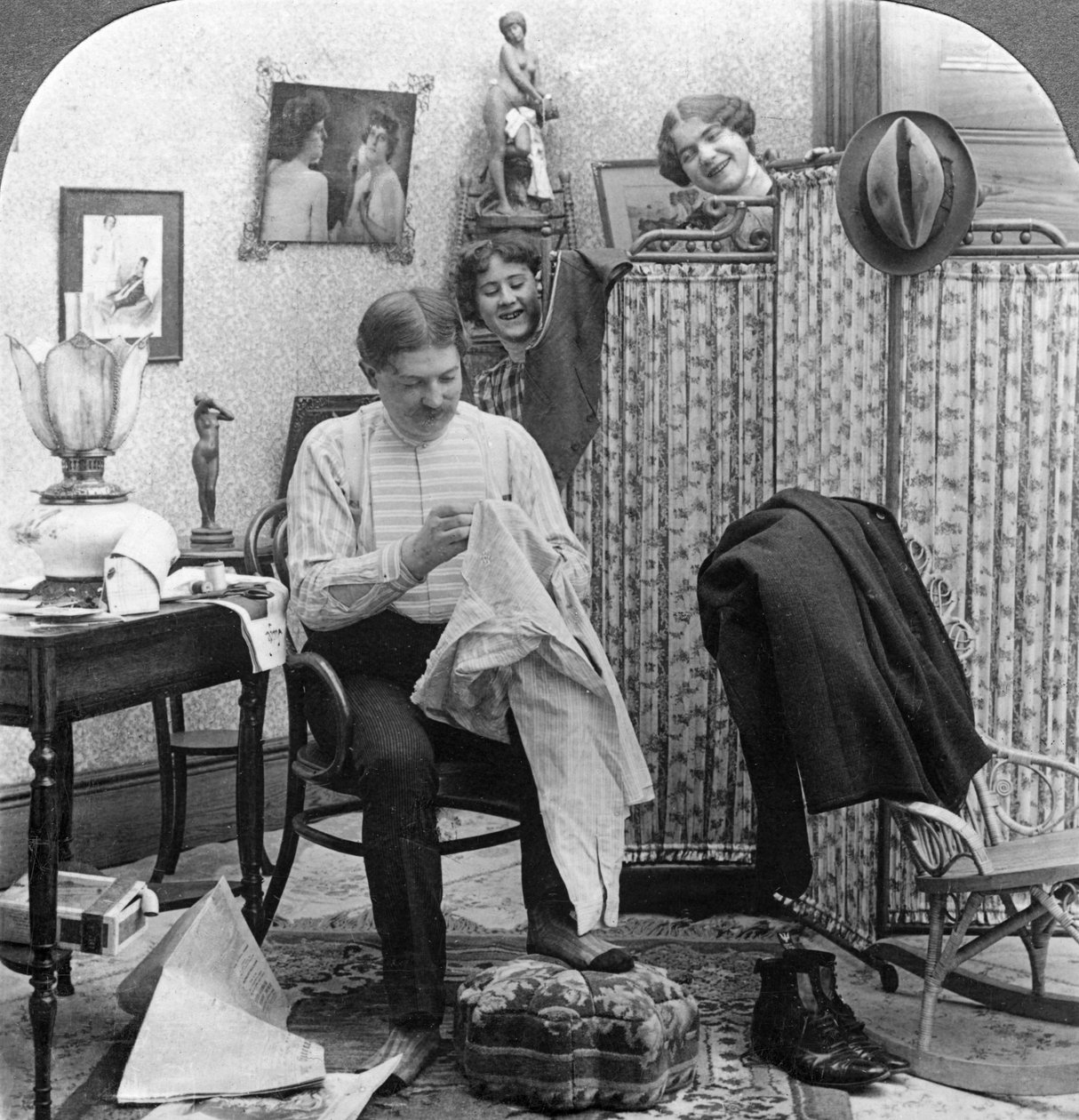 femminile · donne · donna · la gente · maschio · uomo · uomini · domestico · casa · seduta · ridere · paese · uomo · guardare · abiti · vestito · sedia · posizione · secolo · divertimento · riso · divertito · divertimento · camicia · cucito · mobili · signora · concetto · messo · monocromo · celibe · gli stati uniti di ameri · s unita · diciannovesimo secolo · nero bianco · nero e bianco · 1900s · ventesimo secolo · diciannovesimo secolo · americano · gli s.u.a. · photograph · stereoscopic card · american stereoscopic company · The Print Collector/Heritage Images |