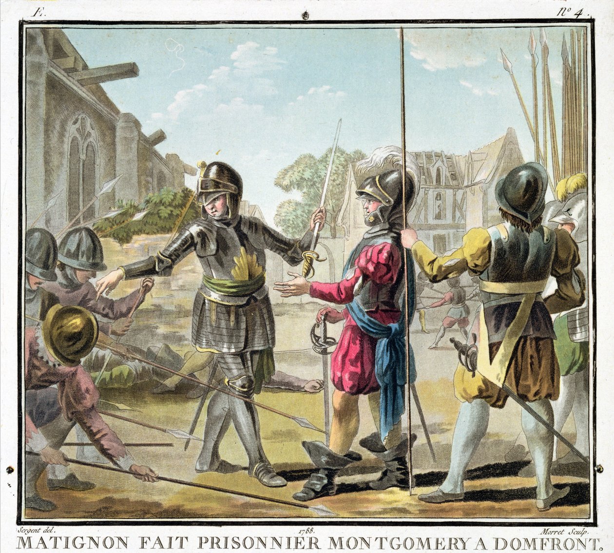 Jacques il Goyon, Signore di Matignon, prende Montgomery prigioniero a Domfront, inciso da Jean Baptiste Morret, 1788(Jacques il Goyon, Lord of Matignon, Takes Montgomery a Domfront Prisoner, engraved by Jean Baptiste Morret (fl. 1790-1820), 1788 )Antoine Louis Francois Sergent-Marceau |