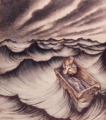 Danae e suo figlio Perseo messi in una cassa e gettati in mare, 1914(Danae and her son Perseus put in a chest and cast into the sea, 1914)Arthur Rackham |