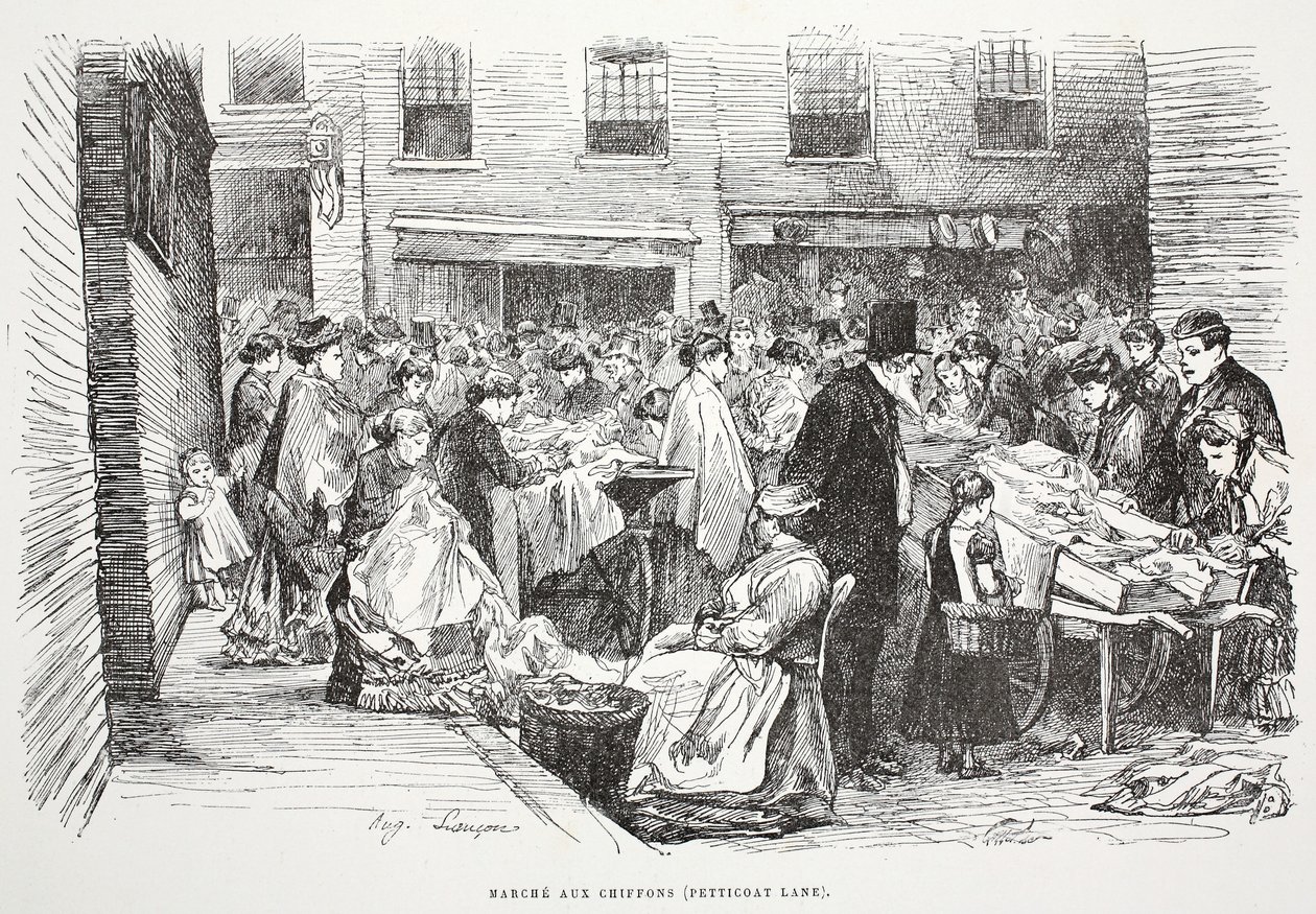 Marche aux Chiffons (Petticoat Lane), illustrazione da 'La Rue a Londres', pub. da G. Charpentier et Cie, 1884(Marche aux Chiffons (Petticoat Lane), illustration from 'La Rue a Londres', pub. by G. Charpentier et Cie, 1884 )Auguste Andre Lancon |