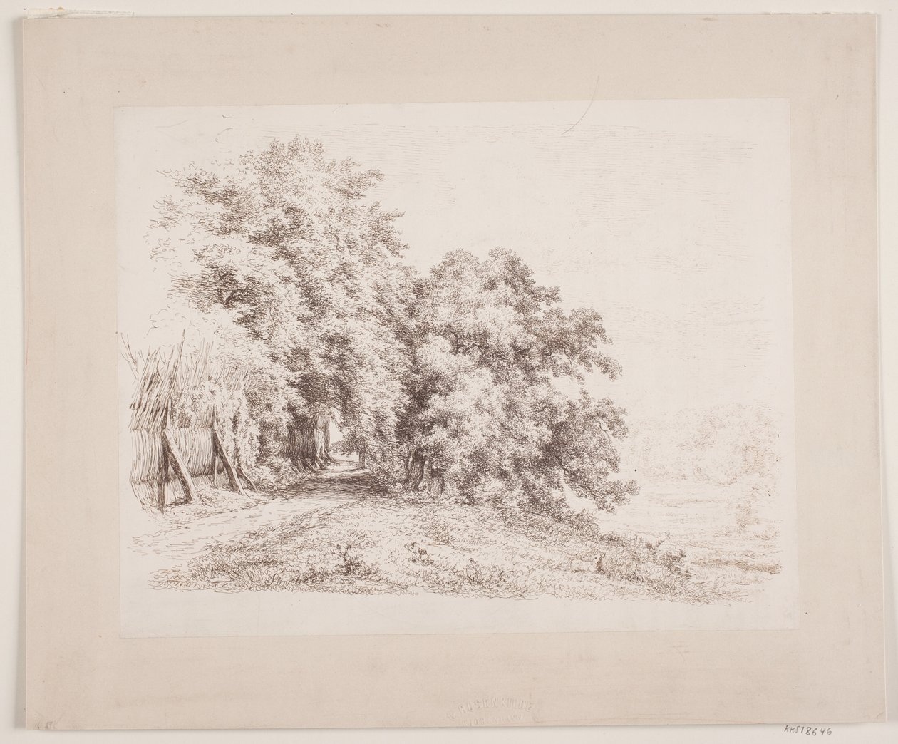Strada di ghiaia tra alberi e prati(Rishegnet vej forbi træer og enge)Axel Schovelin,Georg Henricus Rosenkilde(printer) |