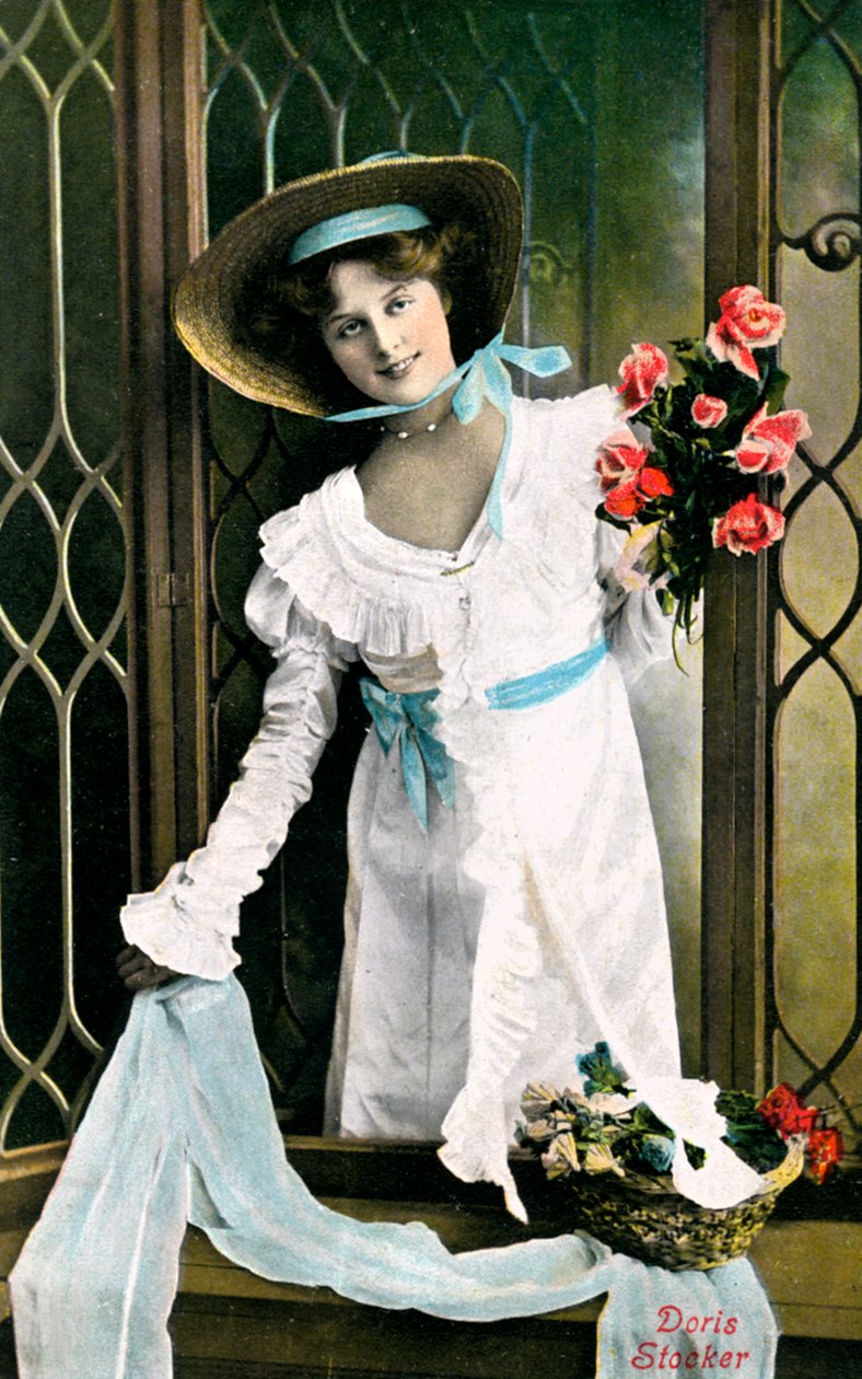 natura · portrait · femminile · donne · donna · la gente · comunicazioni · cappello · fiore · fiori · pianta · arti · spettacolo · teatro · abiti · colore · colore · fase · vestito · victorian · secolo · cartolina · fotografia · signora · interpretazione · effettuazione delle arti · lunghezza completa · una persona · attore · attrice · servizio postale · diciannovesimo secolo · thespian · edwardian · 1900s · gli anni 10 · ventesimo secolo · diciannovesimo secolo · doris stocker · photo postcard · tinted photograph · bassano studio · stocker · doris · The Print Collector/Heritage Images |