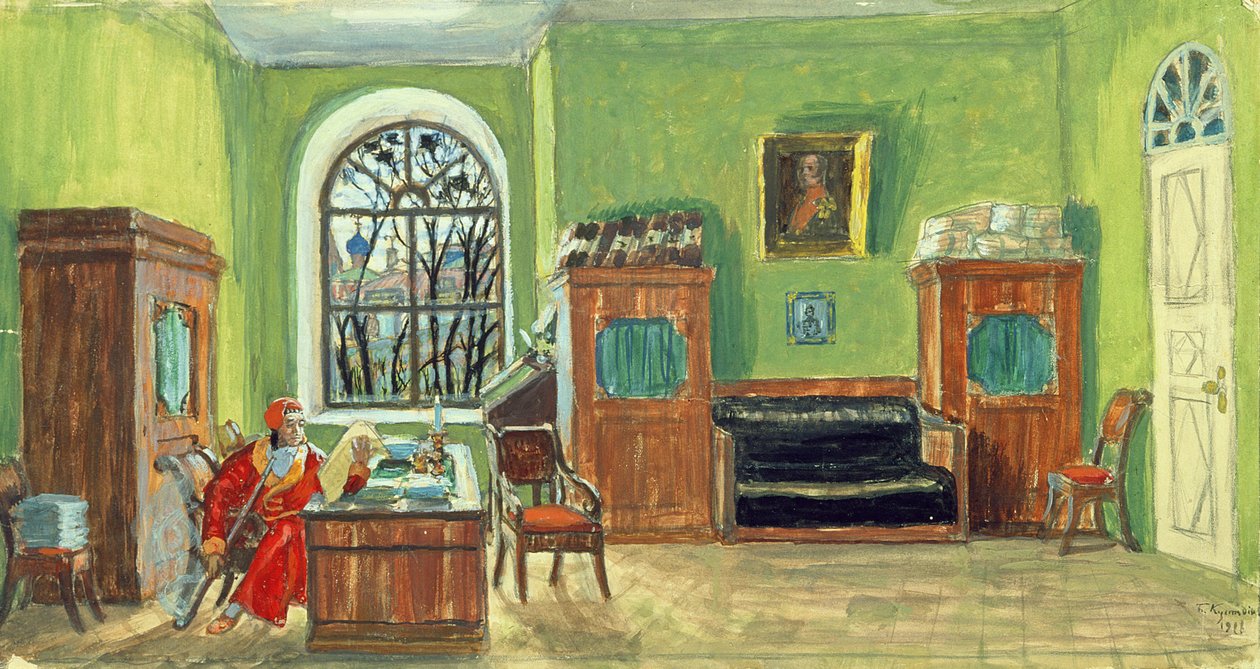 Scenografia per il teatro 'La morte di Pushkin' di M. Saltykow-Schtschedrin, 1914(Stage design for the theatre play 'Pushkin's Death' by M. Saltykow-Schtschedrin, 1914 (watercolour, gouache on paper))Boris Mikhailovich Kustodiev |
