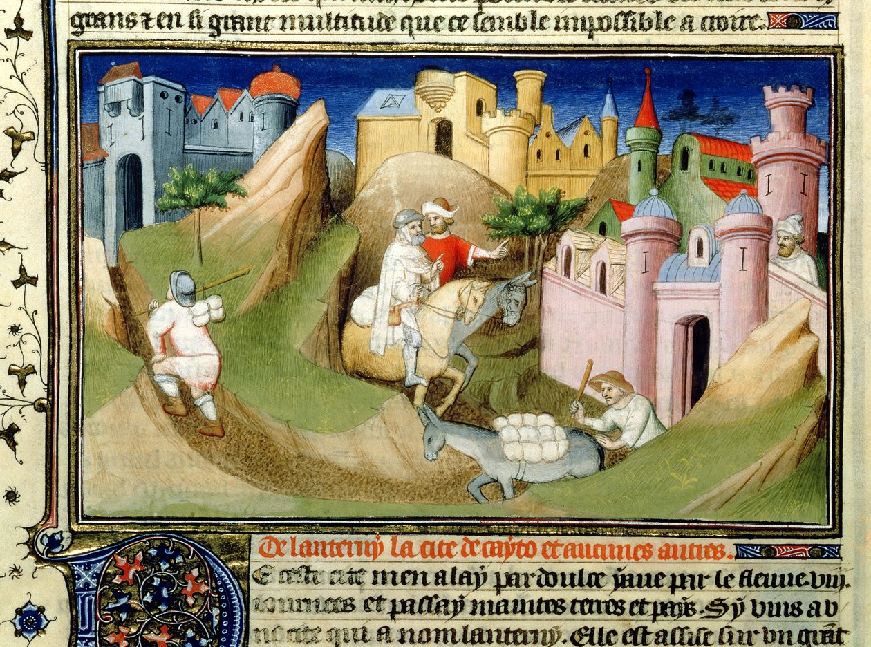 Ms Fr 2810 f.110v, Viaggiatori fuori Pechino con Odorico da Pordenone, dal 'Livre des Merveilles du Monde'(Ms Fr 2810 f.110v, Travellers outside Peking with Odorico de Pordenone, from the 'Livre des Merveilles du Monde', c.1410-12 (tempera on vellum))Boucicaut Master |