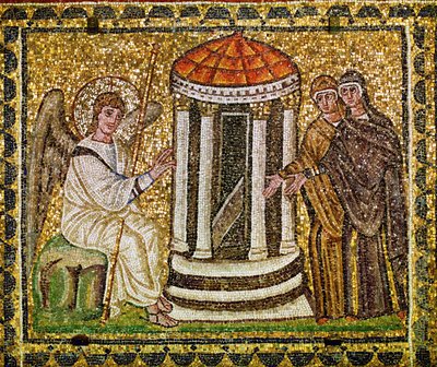 Le due donne e un angelo con aureola e bastone presso il sepolcro vuoto di Cristo, VI secolo (mosaico)(The two women and an angel with a halo and a staff at Christ's empty tomb, 6th century (mosaic))Byzantine School |