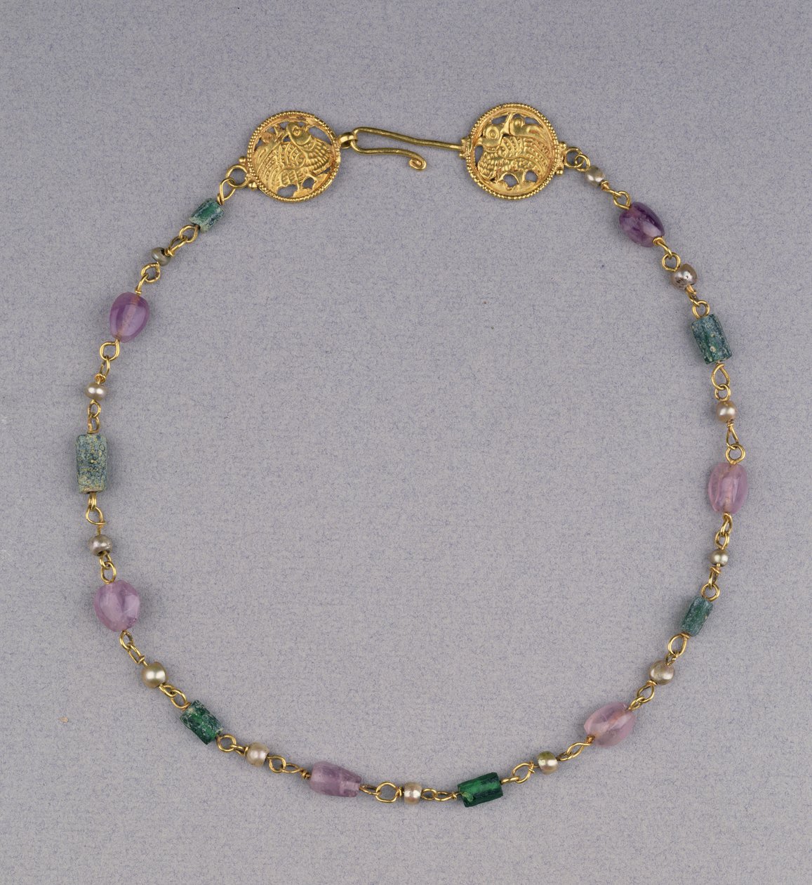 Collana d'oro con perle, ametista e perline di vetro verde con due rotonde traforate d'oro, c.400-550(Gold necklace strung with pearls, amethyst and green glass beads with two gold openwork roundels, c.400-550 (gold, amethyst und glass))Byzantine |