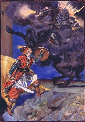 Sono venuto a combatterti, ladro del mio amato, scena da Sucna Murga in Storie per bambini dalle leggende rumene di Moses Gaster (1856-1939) 1921(I have come to fight you, Robber of my Beloved, scene from Sucna Murga in Childrens Stories from Rumanian Legends by Moses Gaster (1856-1939) 1921 )Charles Edmund Brock |