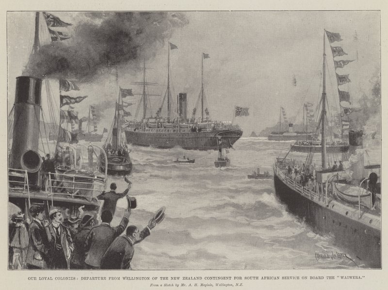 Le nostre fedeli colonie, partenza da Wellington del contingente neozelandese per il servizio in Sudafrica a bordo del Waiwera(Our Loyal Colonies, Departure from Wellington of the New Zealand Contingent for South African Service on Board the Waiwera )Charles John de Lacy |
