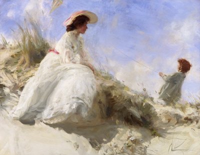 tempo · vista laterale · stagione · femminile · donne · donna · la gente · bambino · bambini · cappello · estate · famiglia · volante · seduta · vento · pittura · giocattolo · giocattoli · sabbia · giorno · bianco · seaside · abiti · colore · colore · duna di sabbia · profilo · madre · ventoso · vestito · aquilone · maternità · secolo · parenting · signora · diciannovesimo secolo · gli anni 10 · ventesimo secolo · diciannovesimo secolo · landscape · charles sims · sims · charles · charles henry sims · national museum cardiff · kay kays · National Museum of Wales/Heritage-Images