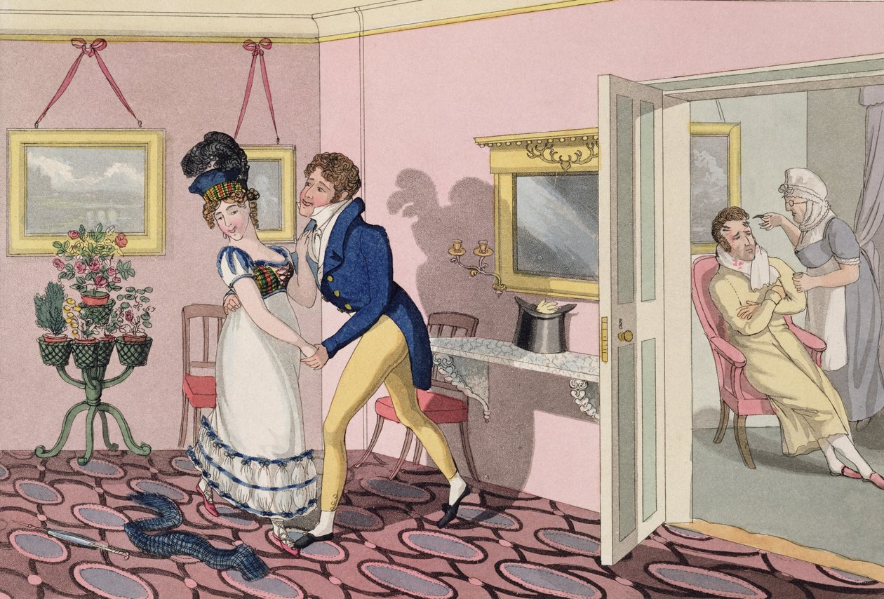 Intrigo, tavola 10 da 'Le qualifiche necessarie di un uomo di moda', pubblicato nel 1823(Intrigue, plate 10 from 'The Necessary Qualifications of a Man of Fashion', published 1823 (hand coloured aquatint))Daniel Thomas Egerton |