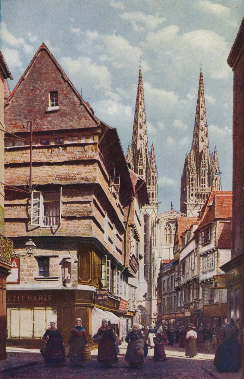 scenico · la gente · religioso · architettura · città · paese · francia · religione · giorno · cattedrale · chiesa · colore · colore · cristianesimo · gotico · posizione · secolo · bretagna · concetto · scena della via · quimper · pubblicazione · la gente della priorità bassa · gli anni 20 · ventesimo secolo · tredicesimo secolo · tredicesimo secolo · landscape · vernacular · geographical magazine · cathedral of saint-corentin · e. a. crook · crook · e.a · The Print Collector/Heritage Images |