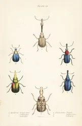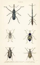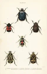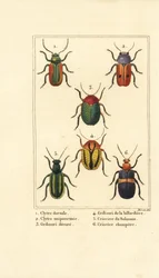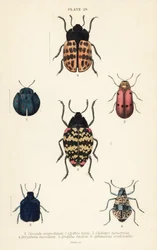 Insetti foglia: Alurnus marginatus, Eumolpus curpreus, Chrysolina cerealis, Chrysolina fastuosa, Oedionychis cincta, Psyllobora vigintiduopunctata(Leaf beetles: Alurnus marginatus 1, Eumolpus curpreus 2, Chrysolina cerealis 3, dead-nettle leaf beetle, Chrysolina fastuosa 4, Oedionychis cincta 5 and 22-spot ladybird Psyllobora vigintiduopunctata 6)English School |
