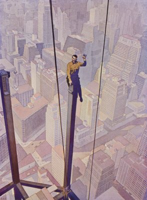 Operaio edile sulla struttura in acciaio di un grattacielo sopra le strade di New York City, New York, USA (litografia a colori)(Construction worker on the steel frame of a skyscraper high above the streets of New York City, New York, USA (colour litho))English School |