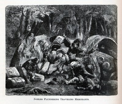 Nobili che depredano i mercanti in viaggio (incisione)(Nobles Plundering Traveling Merchants (engraving))English School |