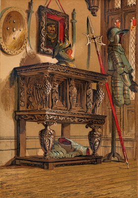 Credenza o armadio elisabettiano nel castello di Warwick (incisione a colori)(Elizabethan sideboard or cupboard at Warwick Castle (coloured engraving))English School |
