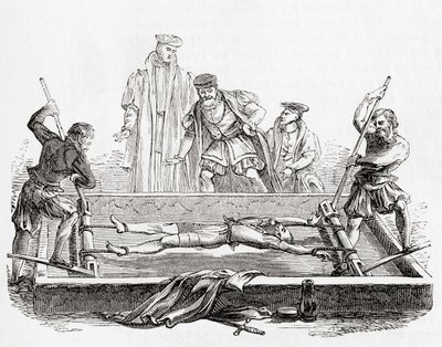 Uomo torturato sulla rastrelliera, da "The National and Domestic History of England" di William Hickman Smith Aubrey (1858-1916) pubblicato a Londra, 1890 circa (litografia)(Man being tortured on the rack, from 'The National and Domestic History of England' by William Hickman Smith Aubrey (1858-1916) published London, c.1890 (litho))English School |