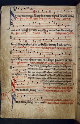 Harley MS 978 f.11v Miscellanea musicale, da "Raccolta di poesie con favole e testi musicali, calendariali e medici" (inchiostro e colore su pergamena)(Harley MS 978 f.11v Musical Miscellany, from 'Collection of poems including fables and musical, calendrical, and medical texts' (ink & colour on vellum))English School |