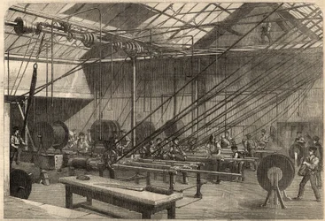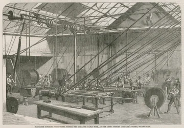 Macchine che coprono con Gutta Percha il filo del cavo atlantico(Machines covering with Gutta Percha the Atlantic Cable wire )English School |