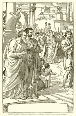 Parata di strada a Roma--Ritorno dai giochi.--Bruto, Cassio e Cesare(Street Pageant in Rome--Returning from the Games.--Brutus, Cassius, and Caesar )English School |