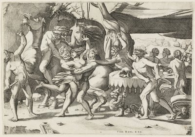 Rapimento di una donna da parte di un uomo e un satiro(Roof van een vrouw door man en sater Strijd tussen de Lapithen en Centauren (series title))Etienne Delaune(print maker),Enea Vico(after print by),Rosso Fiorentino(after design by) |