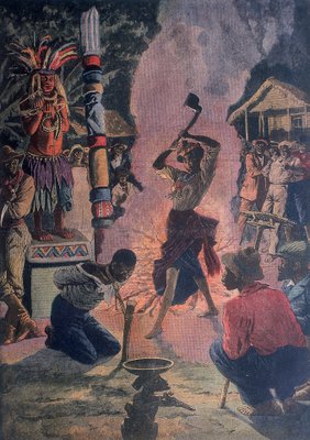 Sacrificio umano durante una cerimonia Voodoo, La Fayette, Louisiana, U.S.A.(Human sacrifice during Voodoo ceremony, La Fayette, Louisiana, U.S.A)French School |