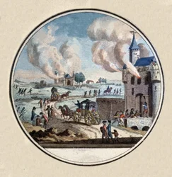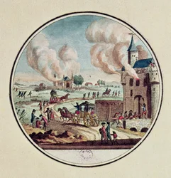 Il saccheggio e la distruzione dei castelli e l'emigrazione di principi e cortigiani nel luglio 1789(The Pillage and Destruction of Chateaux and the Emigration of Princes and Courtiers in July 1789 (colour engraving))French School |