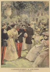Ballando la farandola a una festa in giardino al Palazzo dell'Eliseo(Dancing the farandole at a garden party at the Elysee Palace )French School |