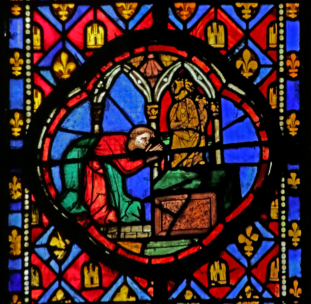 Vetrata raffigurante Teofilo davanti a una statua della Vergine Maria(Window depicting Theophilus before a Statue of the Virgin Mary )French School |