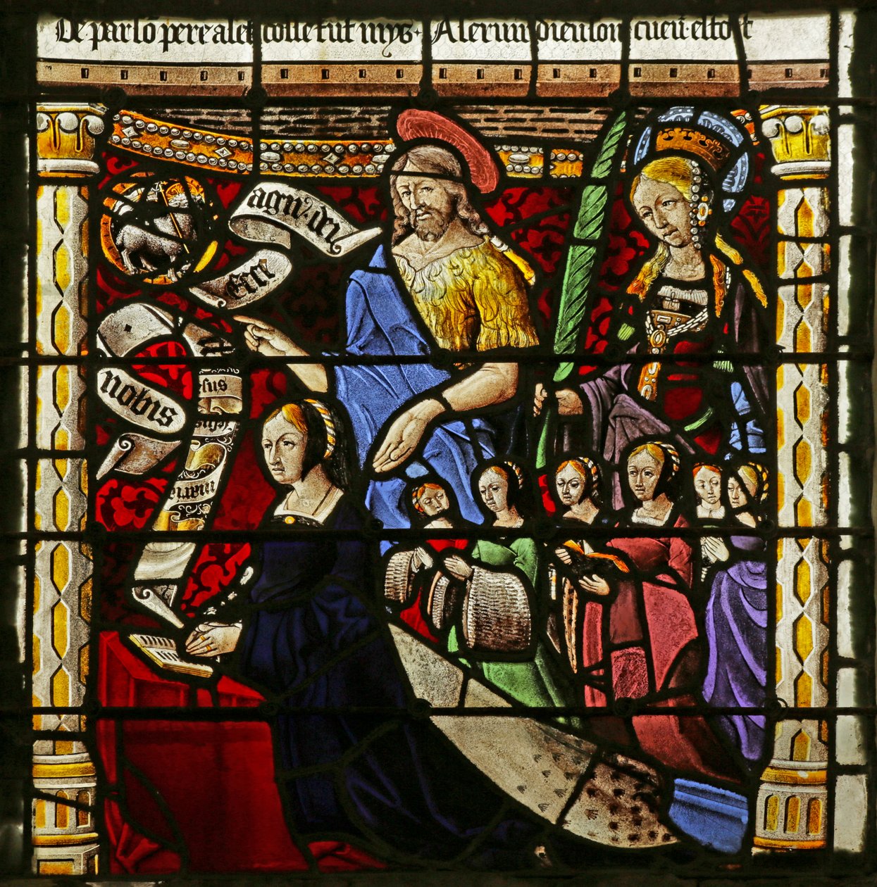 Vetrata raffigurante Donatore con le sue Sei Figlie, San Giovanni Battista e una Martire(Window depicting Donor with her Six Daughters, Saint John the Baptist and a female Martyr )French School |