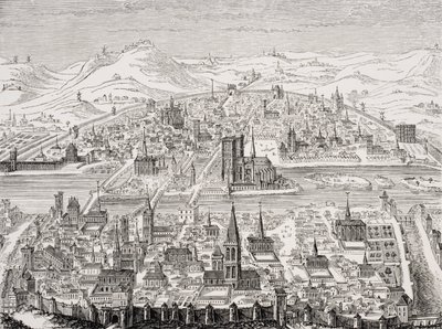 Vista prospettica di Parigi, facsimile di una lastra di rame di Leonard Gaultier (1561-1641) 1607, da 'Le Moyen Age et La Renaissance' di Paul Lacroix (1806-84) pubblicato 1847(Perspective View of Paris, facsimile of a copperplate by Leonard Gaultier (1561-1641) 1607, from 'Le Moyen Age et La Renaissance' by Paul Lacroix (1806-84) published 1847 )French School |