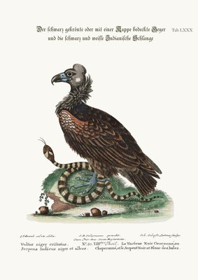 L'avvoltoio nero crestato o coperto, e il serpente indiano bianco e nero, 1749-73(The Crested or Coped Black Vulture, and the Black and White Indian Snake, 1749-73 )George Edwards |