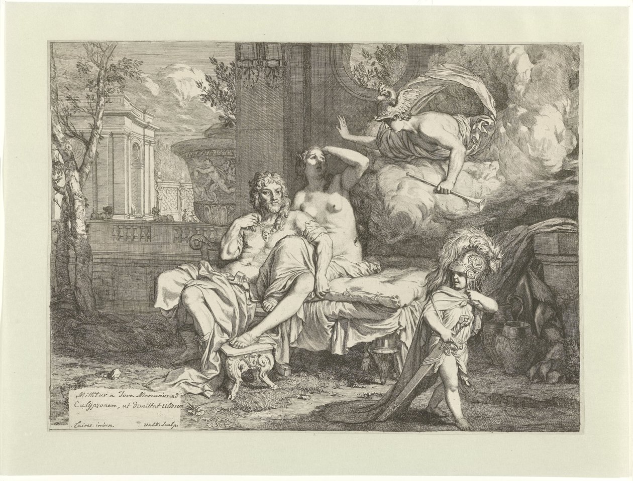 Hermes ordina a Calypso di liberare Ulisse(Hermes Orders Calypso to Release Odysseus)Gerard Valck(print maker),Gerard de Lairesse(after design by) |