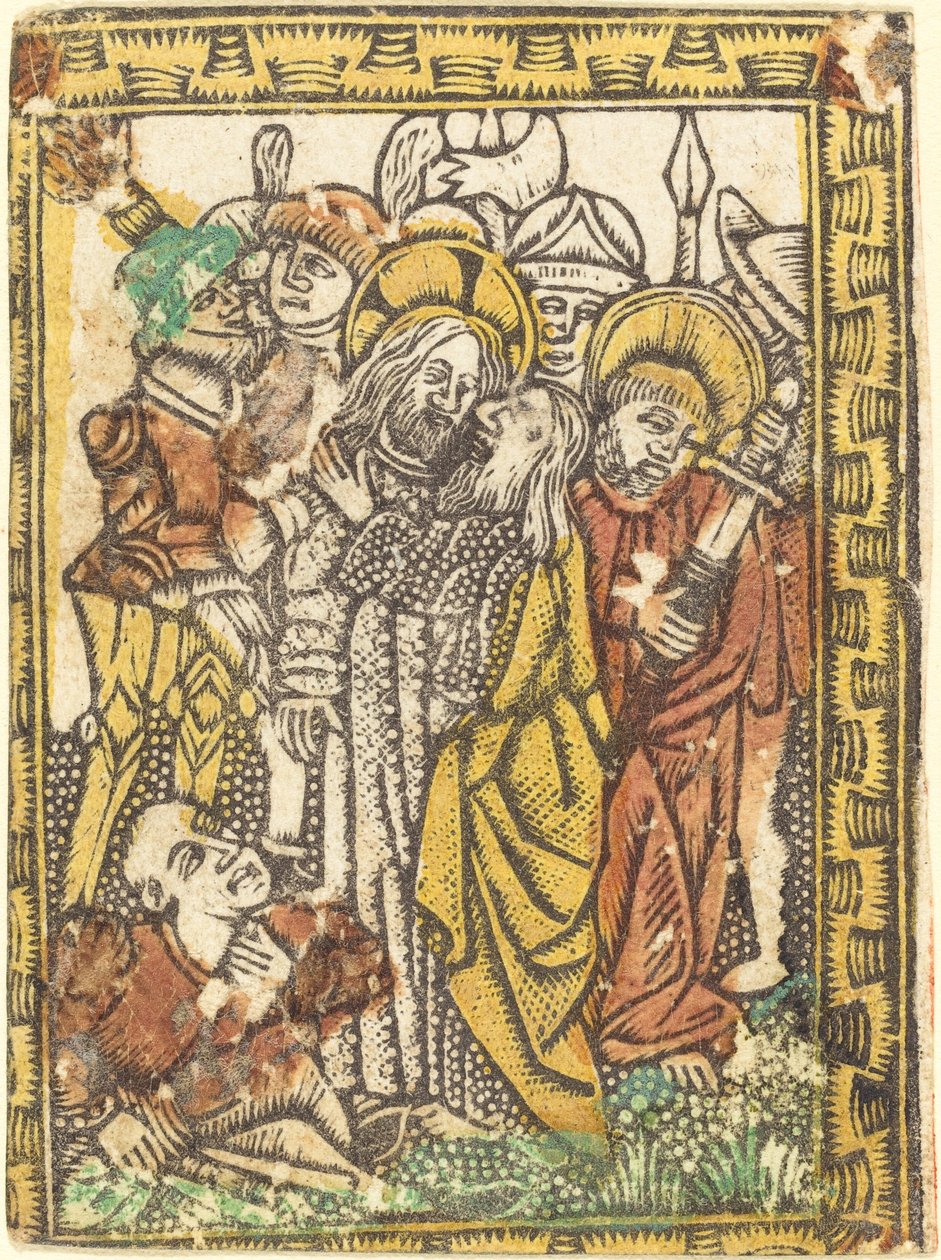 metalcut, hand-colored in yellow, red-brown lake, and green