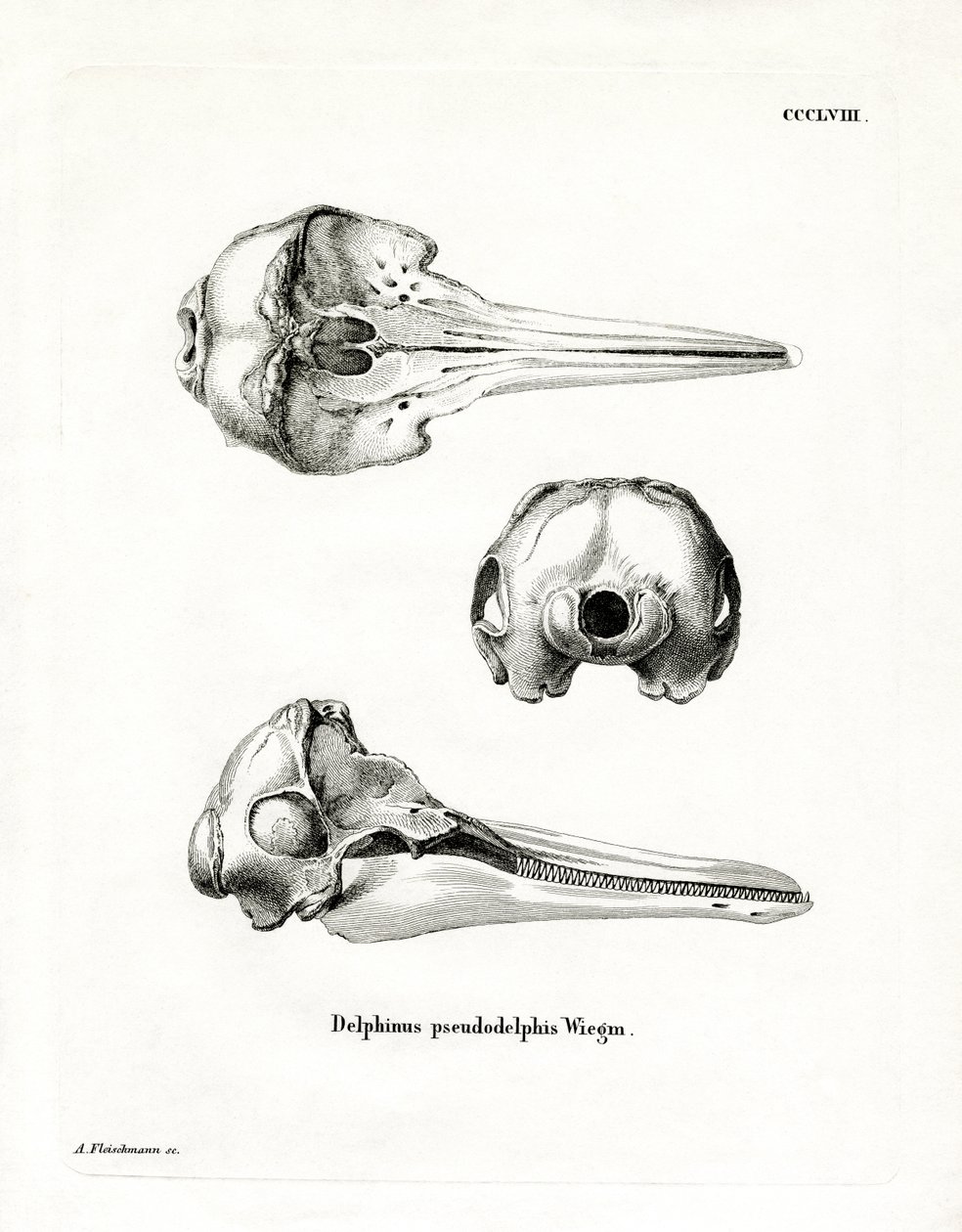 Teschio di Delfino Maculato Pantropicale(Pantropical Spotted Dolphin Skull (coloured engraving))German School |
