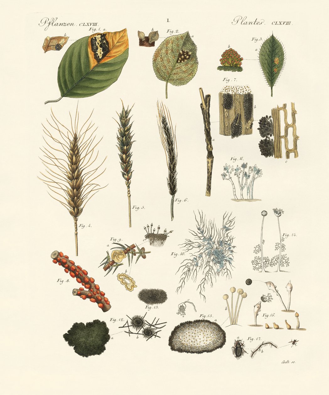 Strani funghi polverosi e filamentosi(Strange dusty and thread fungus (coloured engraving))German School |