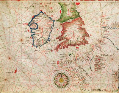 La penisola iberica e la costa nord dell'Africa, da un atlante nautico, 1520 (dettaglio)(The Iberian Peninsula and the north coast of Africa, from a nautical atlas, 1520 (ink on vellum) (detail from 330910))Giovanni Xenodocus da Corfu |