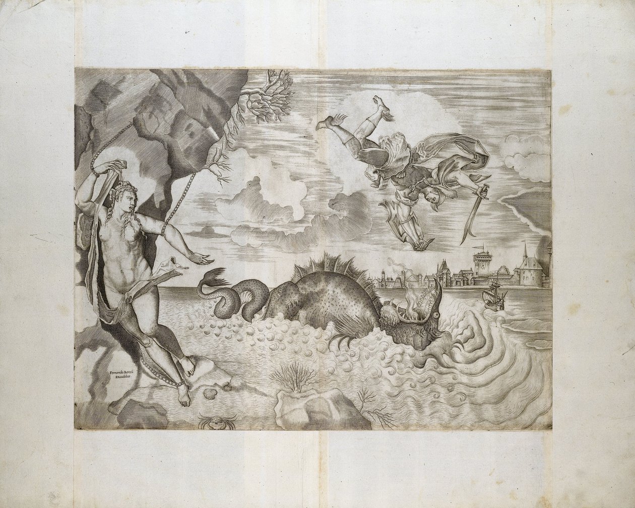 Perseo e Andromeda(Perseus and Andromeda)Giulio Sanuto(print maker),Titiaan(after painting by),Albrecht Dürer(after print by) |