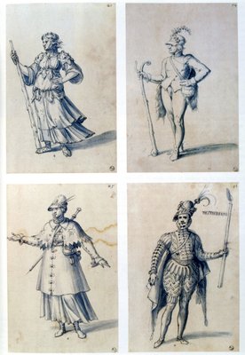 (Costume designs for allegorical characters. Guiseppe Arcimboldo (c1530-1593) Italian painter. Pen, blue ink and watercolour on paper.)Giuseppe Arcimboldo |