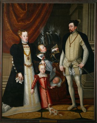 Imperatore Massimiliano II (1527-1576) con la sua famiglia: Maria di Spagna (1528-1603), e i loro figli Anna (1549-1580), Rodolfo (1552-1612) ed Ernesto (1553-1591)(Emperor Maximilian II (1527-1576) with his family: Mary of Spain (1528-1603), and their children Anne (1549-1580), Rodolph (1552-1612) and Ernest (1553-1591) Painting by Giuseppe Arcimboldi (or Arcimboldo) (1527-1593) 1553 Sun. 188x240 cm Ambras Castle, In)Giuseppe Arcimboldo |