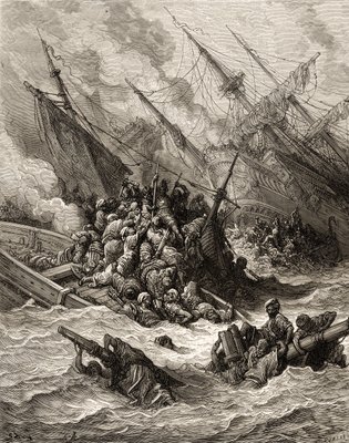 "Battaglia navale di Lepanto": alleanza tra Spagna e Venezia e forze del Papa contro gli Ottomani nel 1571 al largo della Grecia. Incisione di Gustave Dore (1832-1883) da "Storia delle Crociate" di Joseph Francois Michaud(“The Naval Battle of Lepanto” It set up a Spanish, Venetian alliance and Pope forces to the Ottomans in 1571 off Greece. Engraving by Gustave Dore (1832-1883) from “The History of the Crusades” by Joseph Francois Michaud)Gustave Dore |