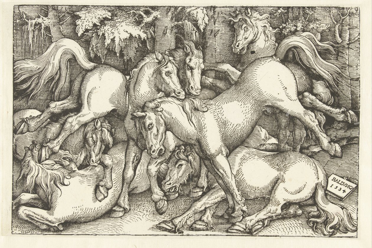 Gruppo di sette cavalli in lotta(Groep van zeven vechtende paarden)Hans Baldung Grien(print maker) |