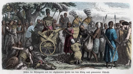 Antico Egitto: i prigionieri portati davanti al faraone vittorioso Ramses II, per essere mutilati, 1866(Ancient Egypt: the prisoners brought before the victorious pharaoh Ramses II, to have their hands cut off, 1866 )Heinrich Leutemann |