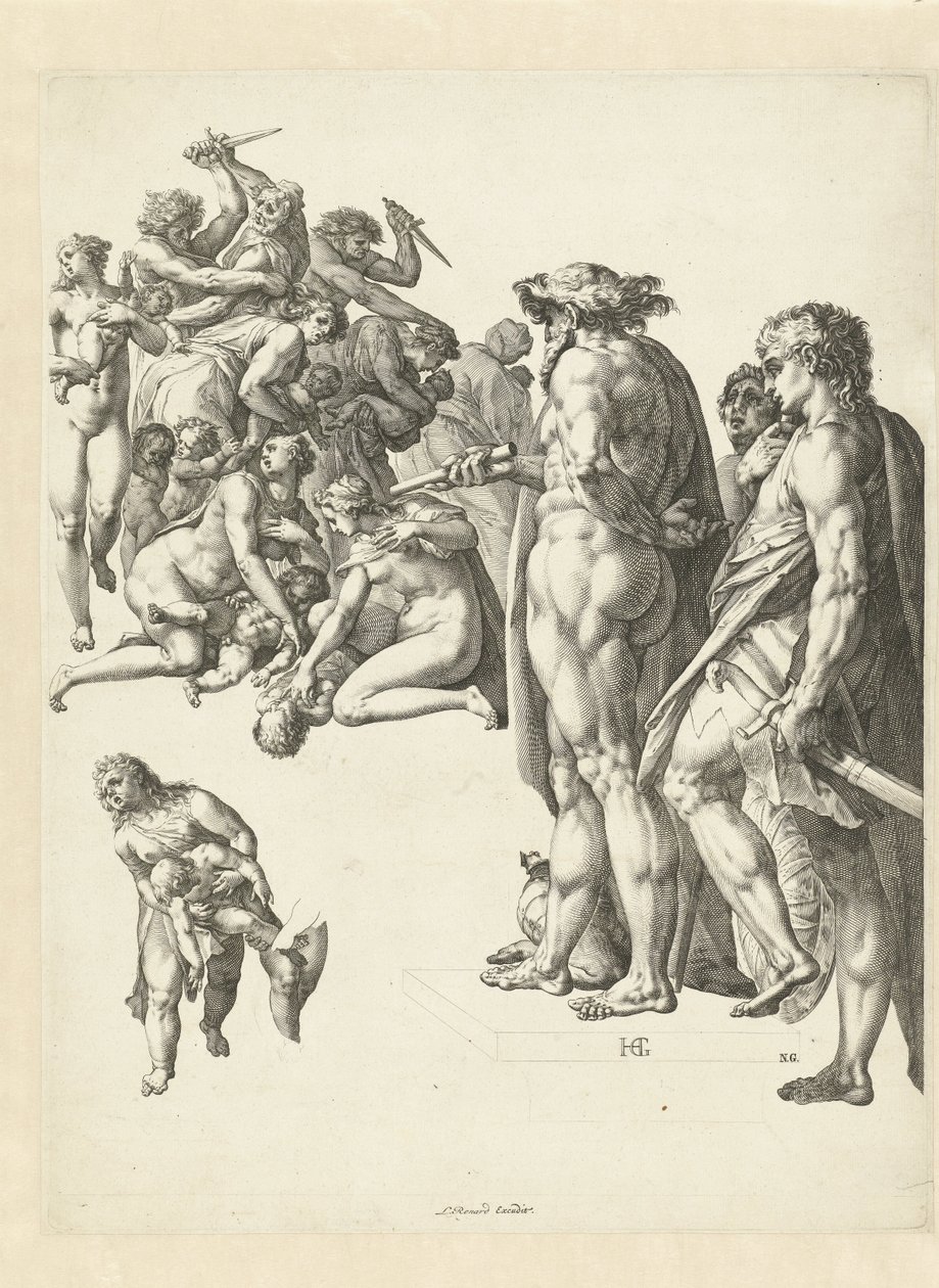 La strage degli innocenti a Betlemme(De kindermoord te Bethlehem)Hendrick Goltzius(print maker),Hendrick Goltzius(after own design by),Marcantonio Raimondi(after print by) |