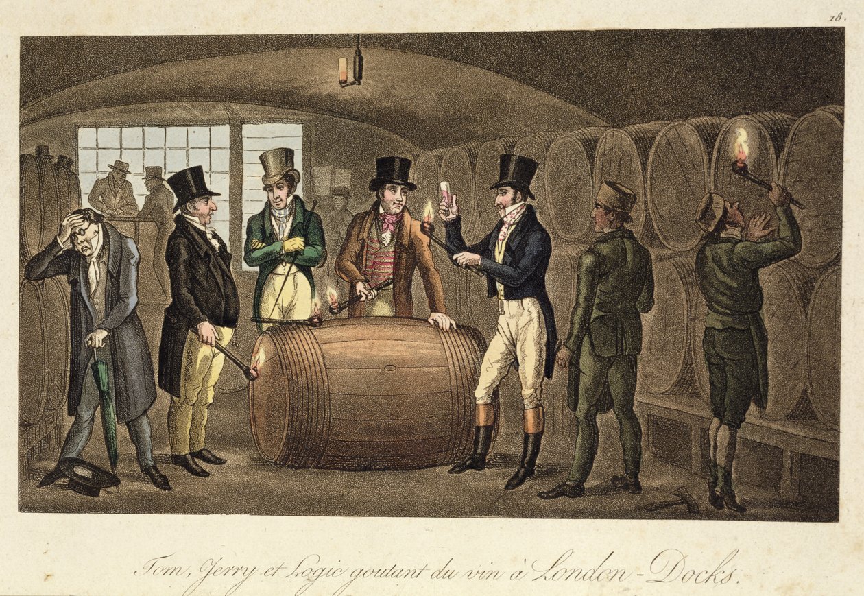Tom, Jerry e Logic degustano vino ai London Docks, da 'Life in London' di Pierce Egan, 1821-22(Tom, Jerry and Logic tasting wine at London Docks, from 'Life in London' by Pierce Egan, 1821-22 (coloured aquatint))Isaac, Robert and George Cruikshank |