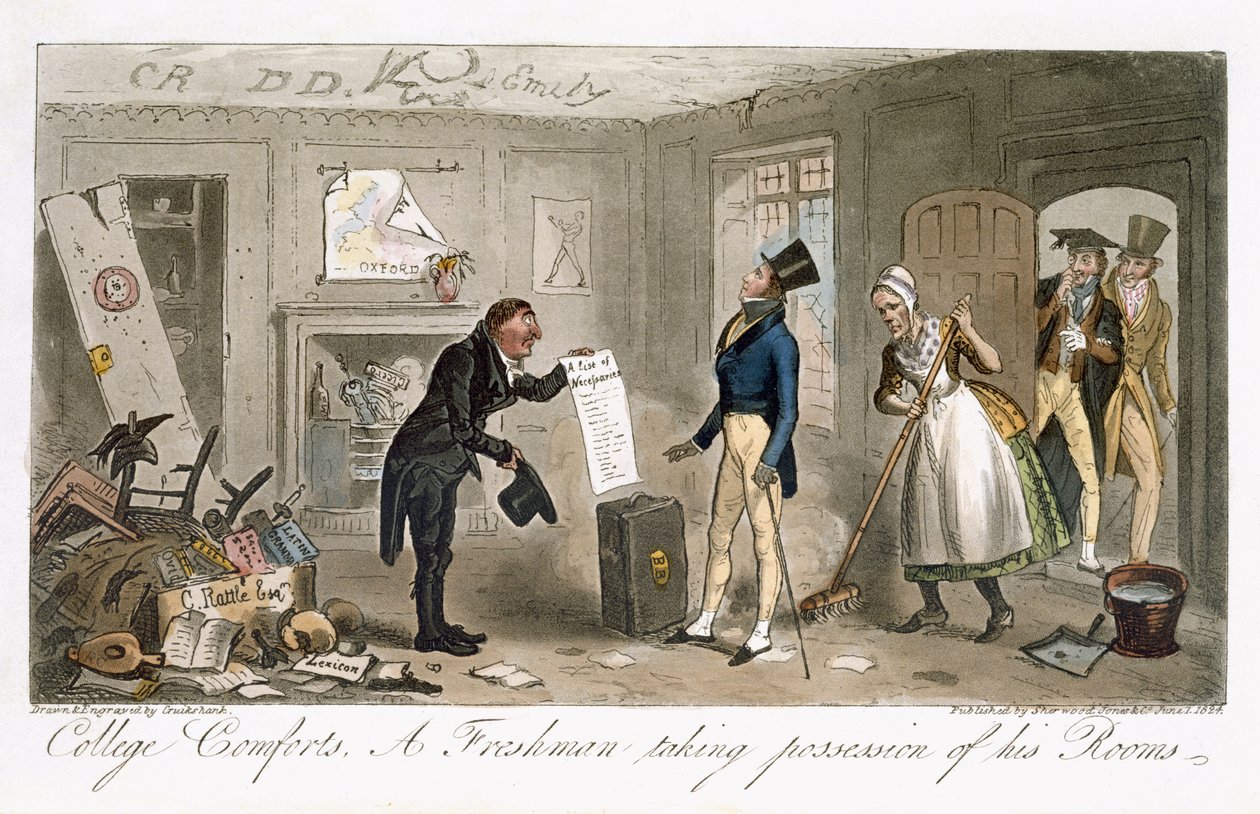 Comfort del college, una matricola che prende possesso delle sue stanze, da 'The English Spy', di Charles Molloy Westmacott, pubblicato a Londra, 1825(College Comforts, A Freshman taking possession of his Rooms, from 'The English Spy', by Charles Molloy Westmacott (1788-1868) published London, 1825 )Isaac Robert Cruikshank |