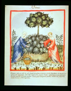 Due donne che raccolgono salvia, dal Tacuinum Sanitatis, c.1390-1400(Nouv Acq Lat 1673 fol.34 Two women picking sage, from Tacuinum Sanitatis, c.1390-1400 )Italian School |